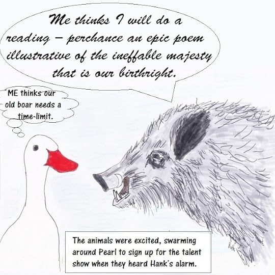 The animals cheered, and picked up Blue Tommy Joe, the new Champion, and carried the exhausted and aching bird out of the barn to parade under the stars. They all joined in the merriment, except for that old gander, Hank. He hung back in the barn, counting his corn.”