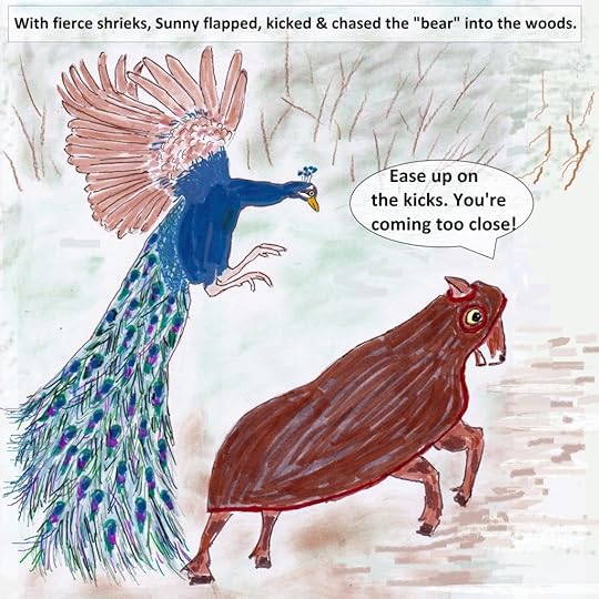 Hank hung back in the shadows to listen. Mrs. Crenshaw said, “Did you see that? The peacock ran off a bear! The farmer shook his head, “And to think I was about to sell him.”