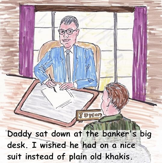 The banker, Mr. Dyson, came out, shook Daddy’s hand, and took us into his office where Daddy sat down beside his big desk. I looked around the office and at the banker. I knew he was important in his fine blue suit, starched snow white shirt, and tie. Suddenly I looked at Daddy, and saw his green khaki shirt and pants, and I was embarrassed.