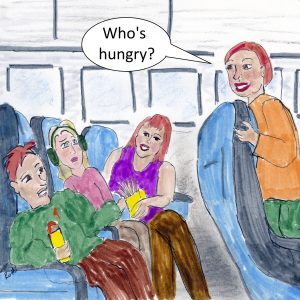 The plane finally landed. These odd strangers on a plane departed as loud as they’d boarded. My blind date in a bad restaurant was over. Of course, a real blind date wouldn’t have lasted two hours. I’d have been out of there before you could say meatball sub. To paraphrase Forest Grump, strangers on a plane are like a box of chocolates. You never know what you’ll get till it’s too late. You’re stuck with the raspberry nougat that tastes like soap — or you have mustard on your jacket and grease stains on your lap.