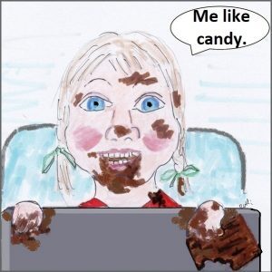 Dad brought out a book and sat down. The toddler popped up. She leaned over the seat waving chocolate-smeared hands too near my face. “I have candy.”