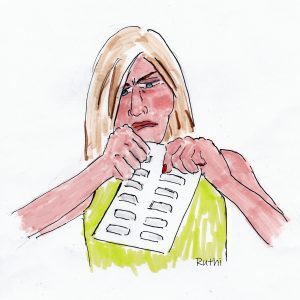 I have migraines. There’s a new medication that is no less than miraculous. When I feel a headache coming on, I don’t panic. I reach for my pills. But now they’ve improved the packaging. They’ve encased my pills in bubbles made of industrial-strength plastic — as inaccessible as though they didn’t exist. The instructions said to bend the plastic and scratch up a corner to peel back the panel. It didn’t work and I broke a nail. Of course, I couldn’t find scissors. I tried opening it with my teeth, then with my car key. No luck. I took a knife to it and managed to get out a pill. Luckily, I had Band-Aids.