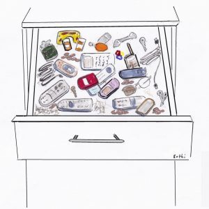 IF YOU CAN’T SEE IT, IT DOESN’T EXISTIf being organized is good, is being super-organized better? Maybe not. I bought a beautiful baker’s cabinet in an antique store. It has twenty small drawers, and I could see right away it was perfect for organizing things. I worked all day, making a place for everything — receipts, notecards, pens, paints, and scissors.