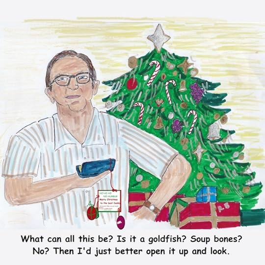 But the hobo! No matter what I did, he was still a lumpy, lopsided, blob, held together by a half-roll of tape. I sat him between the boxes with the pen and tie clip. They didn’t go together at all. I decided the only thing to do was tie them together with a note. I made a card from the cardboard that came inside Daddy’s new shirt and tied the three gifts to it with red and green ribbon. It looked funny. Daddy would laugh.