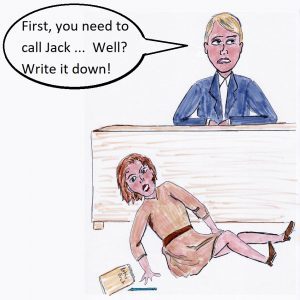 “Of course not! He started running his list. ‘Take these down. I need the reports on the Jackson case. Then call Jack Simmons’ assistant and set up lunch for Thursday. Order my new business cards ….’ and on and on. Still sprawled on the floor in pain, she took down his list.