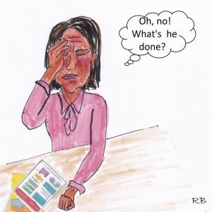 “Almost that bad. Yesterday he called her to come into his office to go over the list of things he needed her to do. She went in with her note pad, but tripped over his basketball sneakers dropped by the door, smacked into the coffee table, twisted her ankle, and fell to the floor.”
