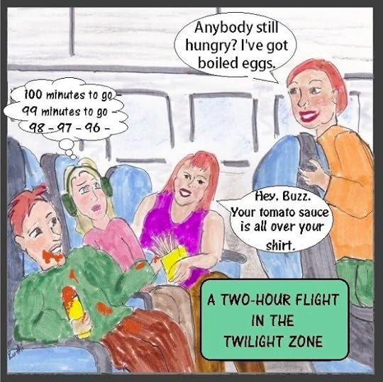 Finally, the plane took off. Good! Only two hours to go, and they’re almost through eating. But they weren’t. Dad turned now, and asked, “What some fries?” He passed the greasy container to the boy. The girl wanted some too, so he passed the container across me, and two slinky limp fries plopped onto my lap.