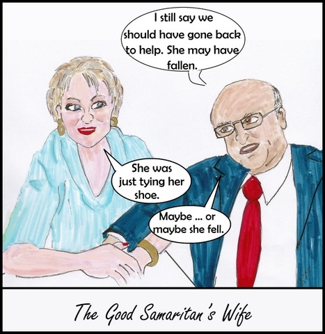 I’m married to a good Samaritan. Ron’s world is full of people who need him to care about them, help them, solve their problems. He knows they’re out there, and at the feeblest sign of a person in distress, he is overwhelmed with goodness and compelled to respond. He must because he is the only one who can — the cost or risk be hanged.