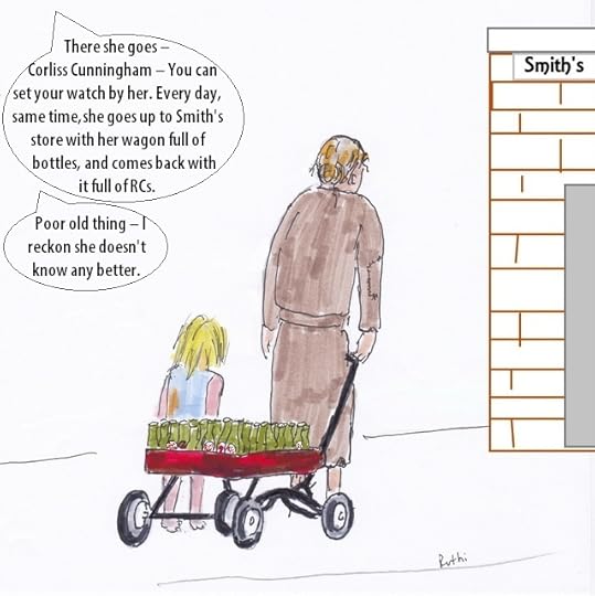 Grandma shook her head and tsked. “There she goes. You can set your watch by Corliss Cunningham – she passes here every day, same time, with her soda-water bottles and that pitiful little young’un tagging along.