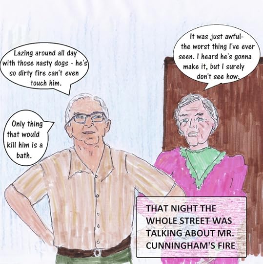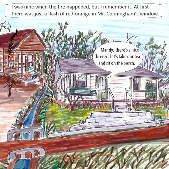 I was nine when the fire happened, but I remember. At first, there was just a flash of red-orange in Mr. Cunningham’s window. Mrs. Ward saw it and screamed, “Oh, dear Lord,” and ran to the phone. By the time she came back, big, ugly bursts of red and gold fire were rearing up from the roof, pushing up heavy black smoke that lumbered up to the sky.