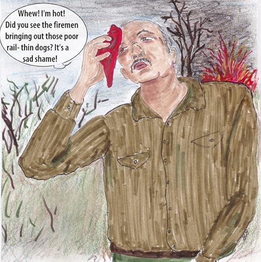 Pretty soon fire trucks and an ambulance came. The firemen sprayed water at the house and knocked the flames back enough for them to go in and bring out Mr. Cunningham, who was gray and choking. The ambulance took him away. Then they sprayed till the fire was gone.