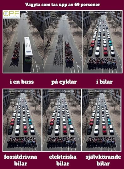 Som exempel brukar jag visa denna kända bild från Australien som illustrerar hur mycket vägyta som tas upp av 69 trafikanter i en buss, på cyklar och till slut: i bilar. Bilarna, trots att det alltså inte är en bil per person, tar i särklass mest yta. De mest innovativa företagen bejublas när de svarar med att lansera elbilar och autonoma bilar. Som givetvis tar exakt samma mängd vägyta som fossildrivna bilar. Det är ofta pengarna som styr innovations-riktningen, och påverkan på välbefinnande mäts inte som framgångsfaktor.