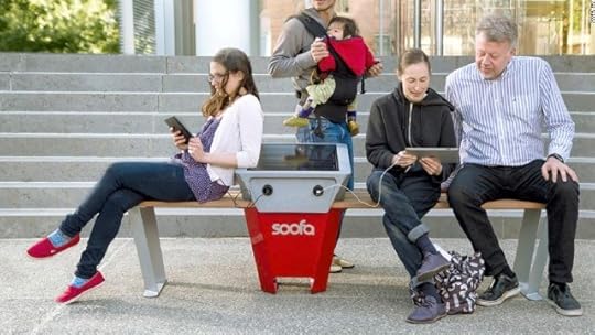 I detta exempel har man installerat en solladdare för mobila enheter på en parkbänk. Man har säkerställt att solladdaren sitter i mitten av bänken och sticker upp en bra bit. Återigen så blir det design av en bänk som man inte kan vila liggande på om man är människa som har det behovet.
