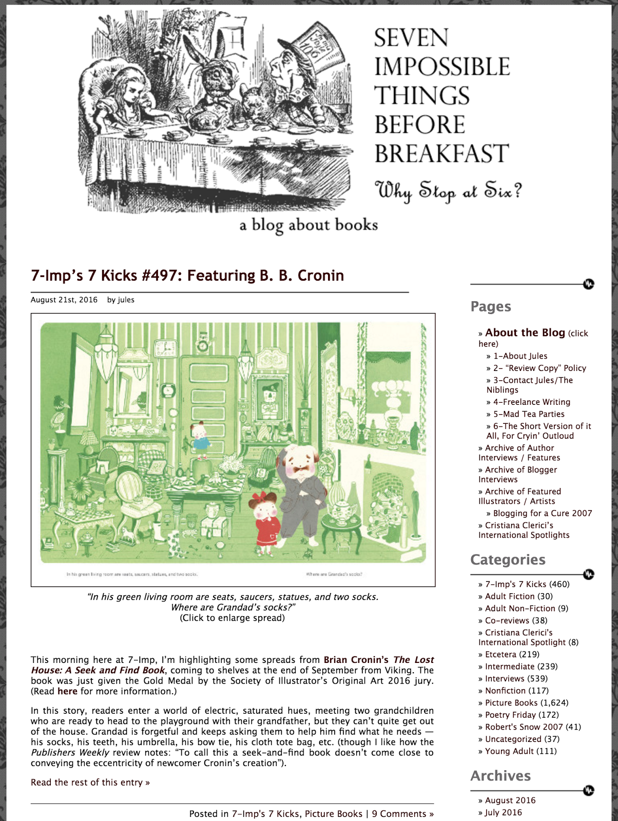 Be sure to drop by Seven Impossible Things Before Breakfast and wish Jules a Happy Blog Birthday! She has been running this amazing blog about picture books and their creators for ten years this month.
