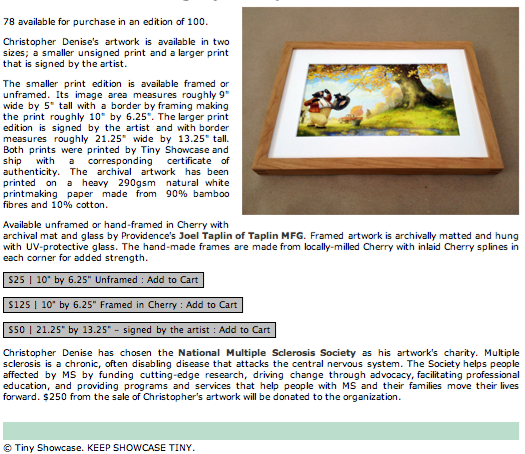 Tiny Showcase is a fantastic company to work with! Beautifully produced prints, very cool people, ...AND a percentage of every sale goes directly to a charity of the artists choice.