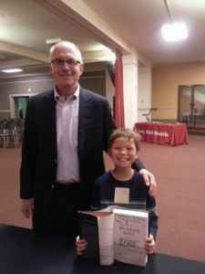 Just finished up a stupendous event at the Town Hall in Seattle sponsored by Elliott Bay Books. Imagine my surprise when I found myself signing a book for someone named Nathaniel Philbrick! Here I am with the young Nathaniel and his book.