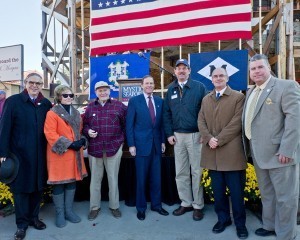 L to R: William Forster, Chairman Emeritus Mystic Seaport Board of Trustees; Melinda Carlisle, Co- Chair “Sail The Morgan” Campaign; Captain Robert Lane, Was aboard the Morgan as a Sea Scout when she came up the Mystic River on November 8, 1941; Senator Richard Blumenthal, Connecticut U.S. Senator; Stephen White, President Mystic Seaport; bestselling author Nathaniel Philbrick; Ed Haberek, Stonington CT First Selectman