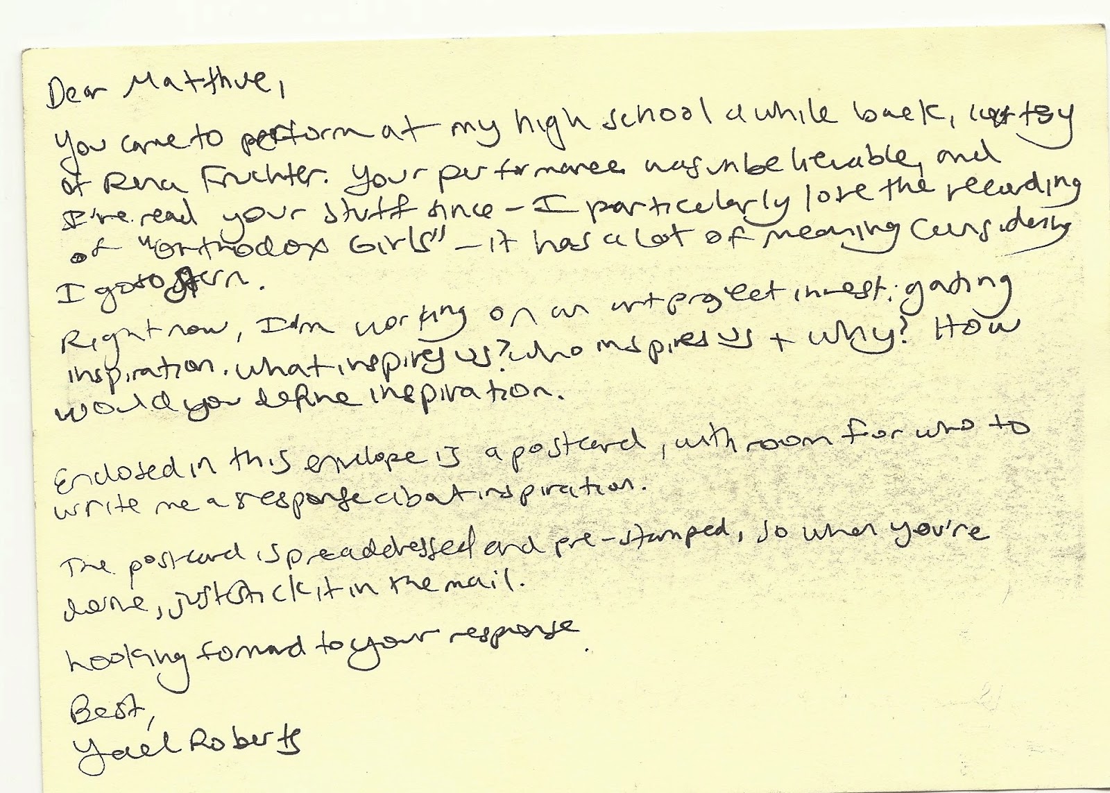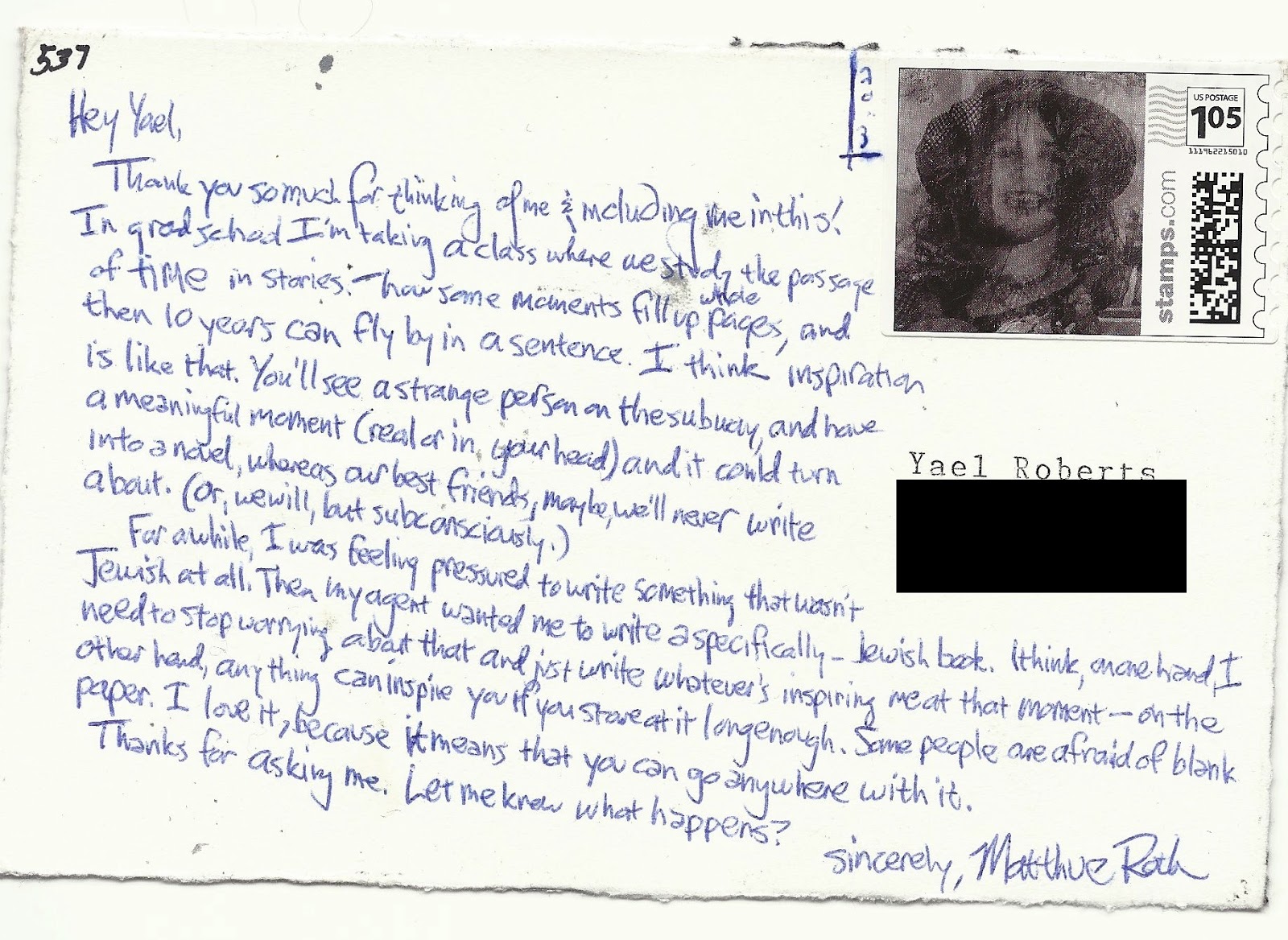 I got a wonderful challenge in the mail from Yael Roberts, whom I met last year as one of the editors of an Orthodox high-school literary magazine. She sent me a postcard out of nowhere -- actually, two postcards -- and asked me about inspiration for an art project. No idea what the project is going to grow into, but here's my little part of the birthing process. Here's what she wrote me (click to embiggen the images):