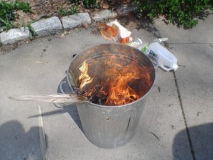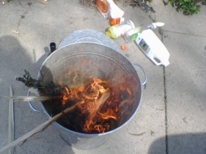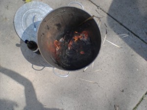 Those big scratchy sticks you see are our lulavs from Sukkot. There's a tradition that you save the lulav to burn today, along with all your hametz. They burned pretty quickly, and let out a smell like sage, which was a nice contrast to that smoky, lung-clogging malodorous odor that you'd expect. (We save our etrogim, by the way. They dry out nicely, and they look sort of like the etrog equivalent of dried flowers.)