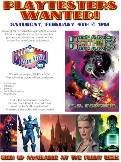 After playtesting, the GURP’s demo of “Tales From the Dream Nebula” is now on tour! That means if I’m at a show, and there’s gaming tables to be had, I’ll be looking to run this game demo after the event, usually after the vendor booths are closed.