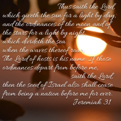 Ponder how regularly the sun rises and sets each day, how the moon and stars appear to light each night. If those ordinances, set by God at creation, cease from before God, then the covenant is void.