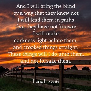 And I will bring the blind by a way that they knew not; I will lead them in paths that they have not known: I will make darkness light before them, and crooked things straight. These things will I do unto them, and not forsake them.
