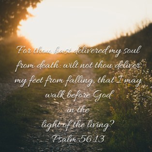 For thou hast delivered my soul from death: wilt not thou deliver my feet from falling, that I may walk before God in the light of the living?