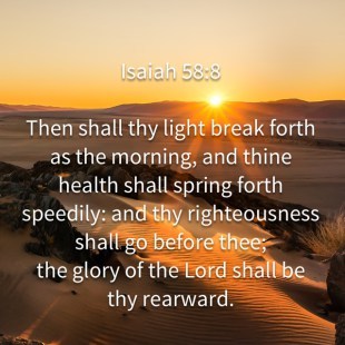 Then shall thy light break forth as the morning, and thine health shall spring forth speedily: and thy righteousness shall go before thee; the glory of the LORD shall be thy rereward.