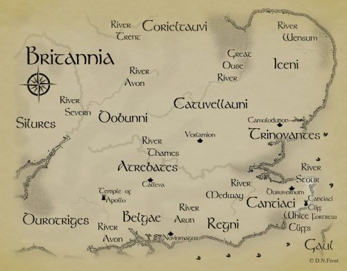 The following is a reblog of a post published on May 20, 2013 about Caesar’s 2nd invasion of Britannia. The epic historical fantasy series, Curse of Clansmen and Kings, is set in Britannia (modern-day Great Britain), Gaul (modern-day France), and Ancient Rome and spans the period from 24AD to 40AD prior to the invasion of Claudius in 43AD. This is Part 3 of the historical and archaeological evidence that supports the theory that Julius Caesar’s invasions of southeast Britannia (55-54BC) help establish Celtic tribal dynasties loyal to Rome. The political unrest of rival tribal rulers in 24AD sets the backdrop to APOLLO’S RAVEN (Book 1 Curse of Clansmen and Kings) where the Celtic warrior princess, Catrin, first meets the great-grandson of Marcus Antonius (Mark Antony).