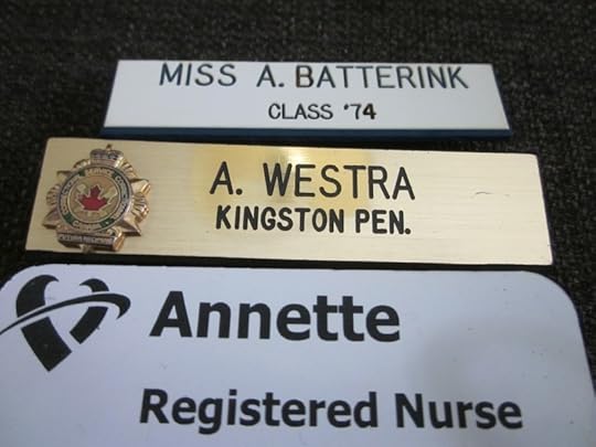 This photo shows some of my name tags: Miss A. Batterink (nursing school) A. Westra (Kingston Penitentiary) and my last one, Annette (Fraser Health Authority for my positions at Surrey Memorial Hospital and Newton Home Health, BC). They also tell a story of how differently nurses were addressed through the years.