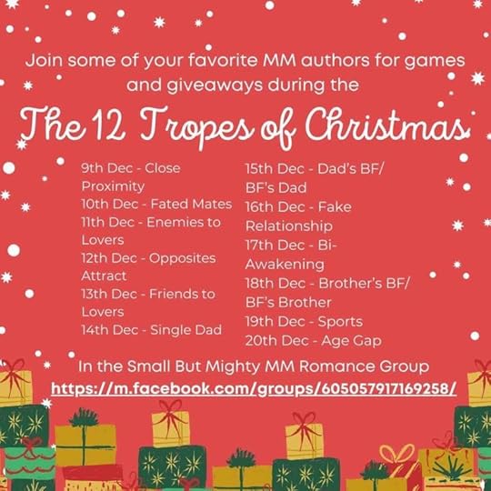 You haven’t forgotten about the 12 Tropes of Christmas in the Small But Mighty M/M Romance group on Facebook, I hope? Have you been there, have you won any of the giveaways? Is there any particular trope extra close to your heart that you’re eagerly awaiting? I’m eyeing bi-awakening day (the seventeenth) and brother’s BF/BF’s brother (the eighteenth). My dream story would be a combination of the two; gimme a brother’s BF bi awakening story and I’ll be a very happy camper.