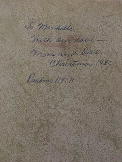 Way back in 1973, my Sunday school teacher gave me The Children's Living Bible. I already owned a Bible Mom and Daddy had given me, but it was the King James Version and I didn't always understand it. The Living Bible, a paraphrase, made things so much clearer. A few years later, for Christmas in 1980, Mom and Daddy gave me The Living Bible. I was a senior in high school, getting ready to spread my wings and leave the safety of the nest. Mom knew I'd need God's word to protect and grow me, and the verse she wrote inside the cover, Psalm 119:11, is a verse that is still very near to my heart.