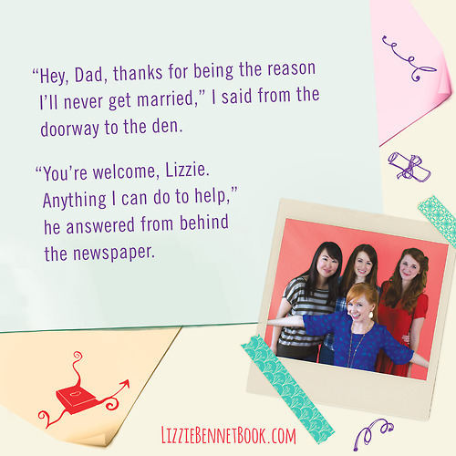 Lizzie Bennet: “Hey, Dad, thanks for being the reason I’ll never get married.”Mr. Bennet: “You’re welcome, Lizzie. Anything I can do to help.”