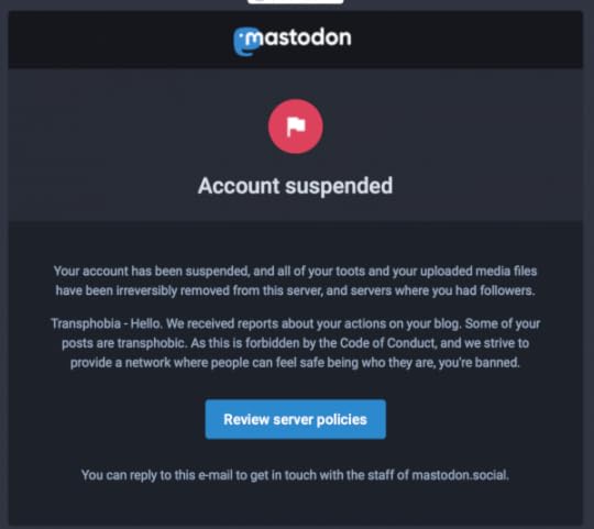 I read your blog and decided that your kind of rhetoric isn’t wanted on mastodon.social. You aren’t convincing me with such terf nonsense.