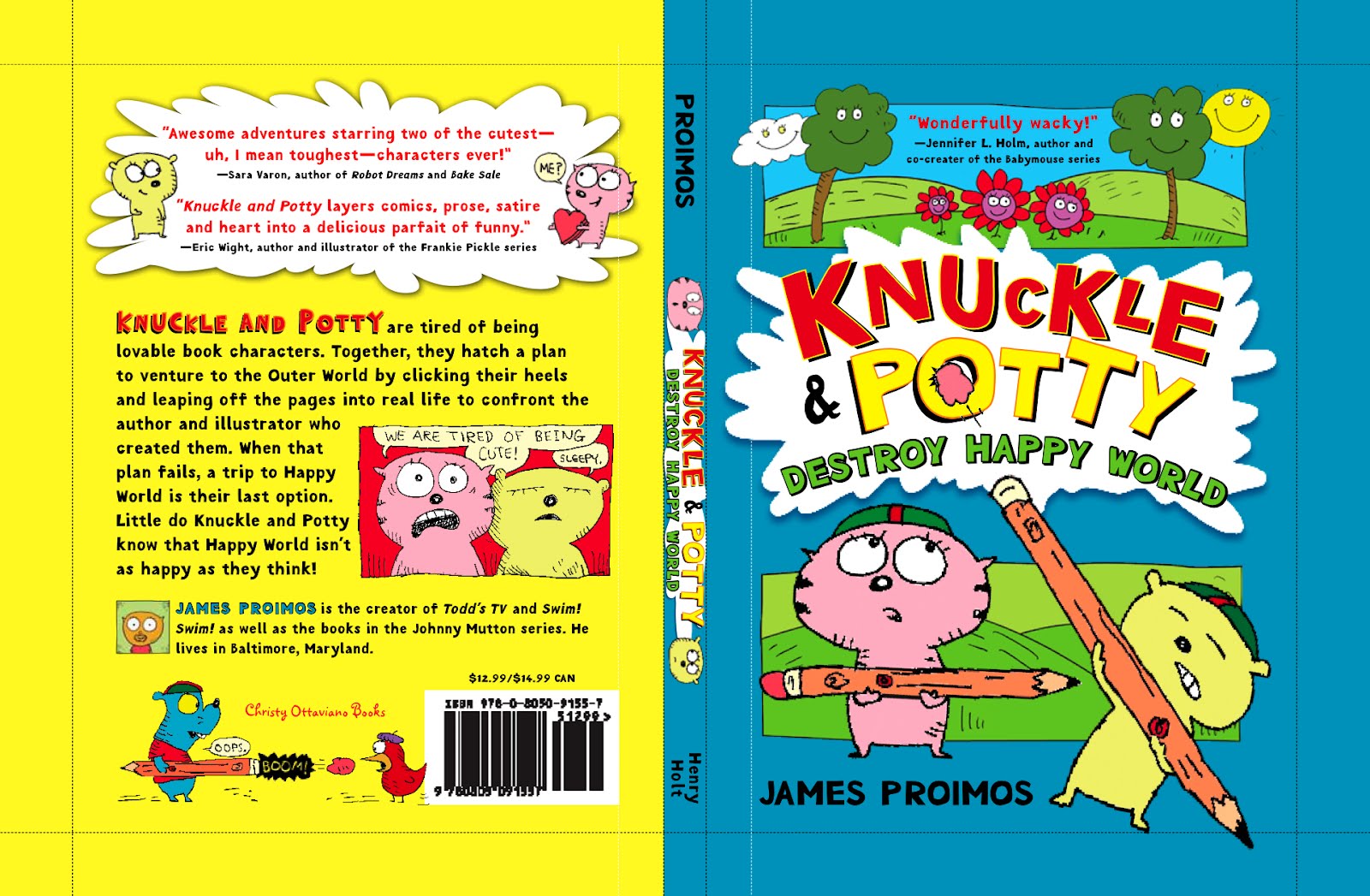 Chafing at the roles forced on them in previous bestsellers with titles like Tiger and Bear Are Cute and Tiger and Bear Are Wholesome, Knuckle Tiggerelli and Potty Polarberg seek help to escape their upcoming outing, Tiger and Bear Go to Happy World. Appeals to their author (who turns out to be not the TV celebrity named on their title pages, but a ghost writer named Gregory) and illustrator get only hostile responses. Knuckle and Potty (respectively, small pink and green outline figures with oversized eyes and lashes) arm themselves with erasers and mount a direct assault on Happy World’s trees and flowers. Alas, these turn out to be less defenseless than their sappy smiles imply. Proimos cranks up the general air of chaos by mixing narrative text with loosely drawn framed and unframed cartoon scenes and trots in other stars of page and screen. Such lights as Winkie the Pug and the rhyme-spouting Chicken in the Beret lend aid and advice.