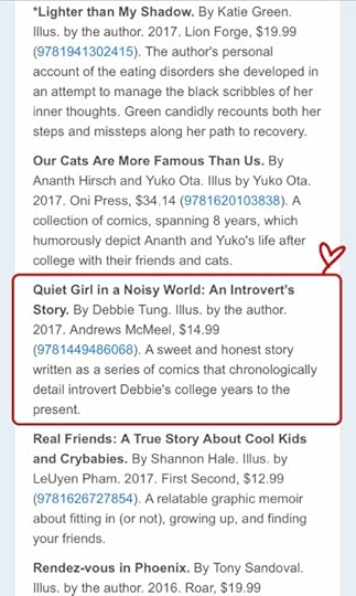 QUIET GIRL IN A NOISY WORLD made the American Library Association’s list for Great Graphic Novels for Teens in 2018! I’m so honoured to be on this list among other amazing books and authors!