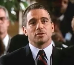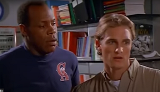 David is sitting there in his suit wearing a clear, plastic coat already dotted with various condiment stains. The joke was funny the first time. Now, maybe not as much. Roger spots an angel with pitcher Mel Clark (Tony Danza) standing down in the bullpen, so he clues J.P. in to commence operation Get Rid of David. J.P. delivers another gem, turning to David: “I gotta go to the bathroom. I can’t go alone. Bad guys might get me.” Oh, this kid.
