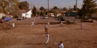 Knox wraps up the interview himself and heads off, even though Ranch was the only one who asked any questions. Not a fan of that as a journalist, but whatever. Ranch looks pissed and also suspicious. Then, because he’s the only loudmouth who matters in the media (or the only actor the movie wanted to pay to say lines), he shouts over to Clark to get a comment. I’m sorry, but where are the communications directors to facilitate these scrums? Roger, J.P. and Knox prepare to head out in the Angels minivan, mentioning the team has won three in a row. Knox feels he owes the boys something, although free baseball games, food and souvies seem to be a fair trade. But we need something fun to break up the Angels baseball, so let’s have some sandlot baseball.