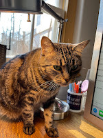 I try to get up a few times during the day to stretch and play with my cat Bella, who is almost always in my study with me. I grab some sort of simple lunch (a bowl of last night’s leftovers, a PBJ) at my desk. Late in the afternoon, I go over to my sister’s house, where there is a good exercise bike and some Pilates stuff, ride, stretch seriously, play with the balls and bands, and watch junky TV. I’m talking home renovation competitions and stuff. Don’t judge.