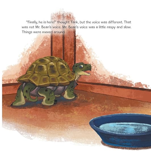 "Where is he?" is about Tank, the Russian tortoise who lost his owner and was placed in a pet store. He missed his owner and routine habits. He goes to a new home. When not in the box, he roams around the house. His favorite meal is string beans.