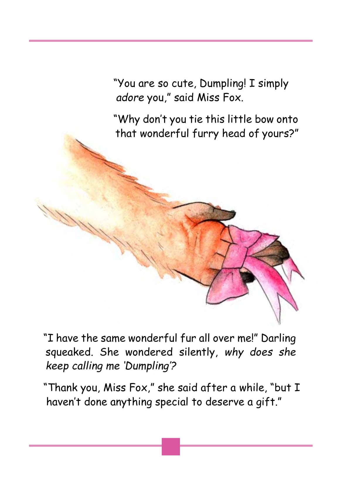 Everyone loves an adventure, and this story is sure to delight young and old (parents). When Darling meets Miss Fox the two become friends, but there is danger in the world, and one must be careful.
