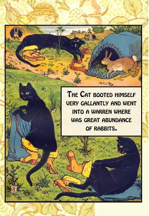 I liked the use of visual direction. From the text, the reader is drawn by the cat below and the boot acts as an arrow toward the second image and then into the third.