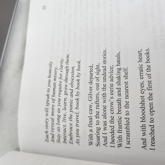 In The Library is a dark poetry narrative that utilizes a main character who’s dialog throughout the book is expressed through poetic stanza and verse, all while utilizing the image of a library to be similar to a graveyard where the main character is asked to read or “remember” 11 different traumatic events.