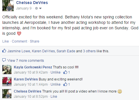 I watched it and as I did, my palms became sweaty and my knees felt weak. I was hoping to see myself through the entire 30 minute commercial, which was set up much like the infomercials you find if you are still watching television in the middle of the night. It was a good commercial but I wasn't in the entire thing: You can find the final commercial https://www.facebook.com/Writer.Chelsea.DeVries/posts/871489056244191