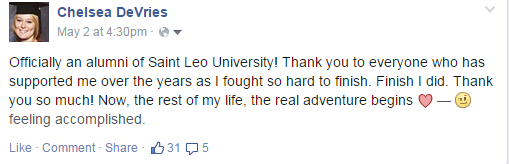 I struggled in every way a person can struggle through my five years in college. I first struggled with living away from home. Then, I struggled with making friends, struggled with finding a job, struggled with balancing work and school, struggled wth figuring out that I didn't want to be an accountant, struggled with my health, struggled with the finances to pay for school, and lastly, I struggled with not giving up and quitting. Without God, I don't think I ever would have made it through. Now, I truly believe that nothing is impossible with God.