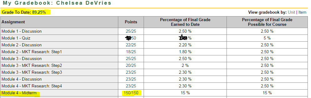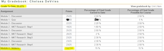 I'm so excited because so far in my current online class(although it was a rough start to get back into the swing of studying and the material was a little dry), I'm doing so good in there. I currently have a 90% and only have one more week left. I literally got 100% on my midterm. That hasn't happened in the longest time.