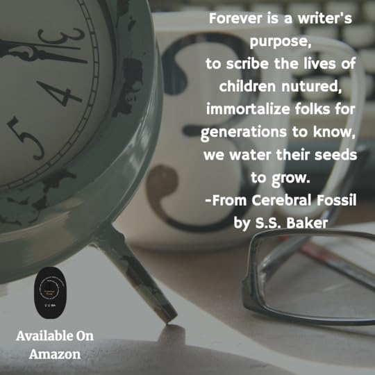 S. Baker: Another great question. So. A fossil is any trace or remains of any once living thing. Cerebral Fossil is the memories, art, thoughts, poetry, books, text messages, love notes, social media posts etc. left behind by any once living being. It’s deeper than that, but I’m okay with my concept inspiring personal interpretations for others.