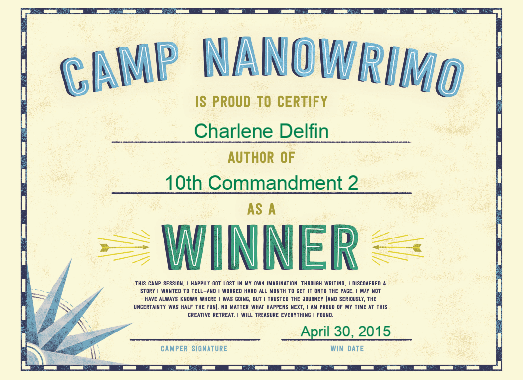 I won in Camp NaNoWriMo 2015 by going past my goal word count of 50,000 words and I finished writing "10th Commandment" by reaching that sweet ending scene. The only thing that needs to be done to "10th Commandment" right now is some mixing and organizing of the scenes, additional scenes and, of course, editing. I need to organize the sequencing of events and make the names match. Because sometimes, just to keep writing, when I don't remember a name, I just write any name. Like, Randy becomes Ben in the middle of the book, and Mark in the end.