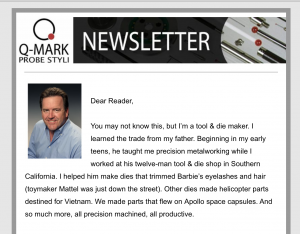 Being genuine and authentic doesn’t have to be hard. Mark’s company manufactures “styli and accessories for the metrology and machine tool industries.” Facts and features prove their products are superior to the competition. But again, no matter what the industry, people do business with people. That might seem obvious, but how many marketing pieces do you see touting the wonderfulness of a particular product or service in “corporate-speak?”