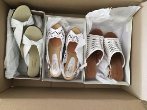 The shoes arrived. I kept two of the pairs from Zappos and will return the other, using a FREE shipping label I printed online. The DSW pair is going back to the store – and I’ll take them myself since returning them would cost an extra $8.50.